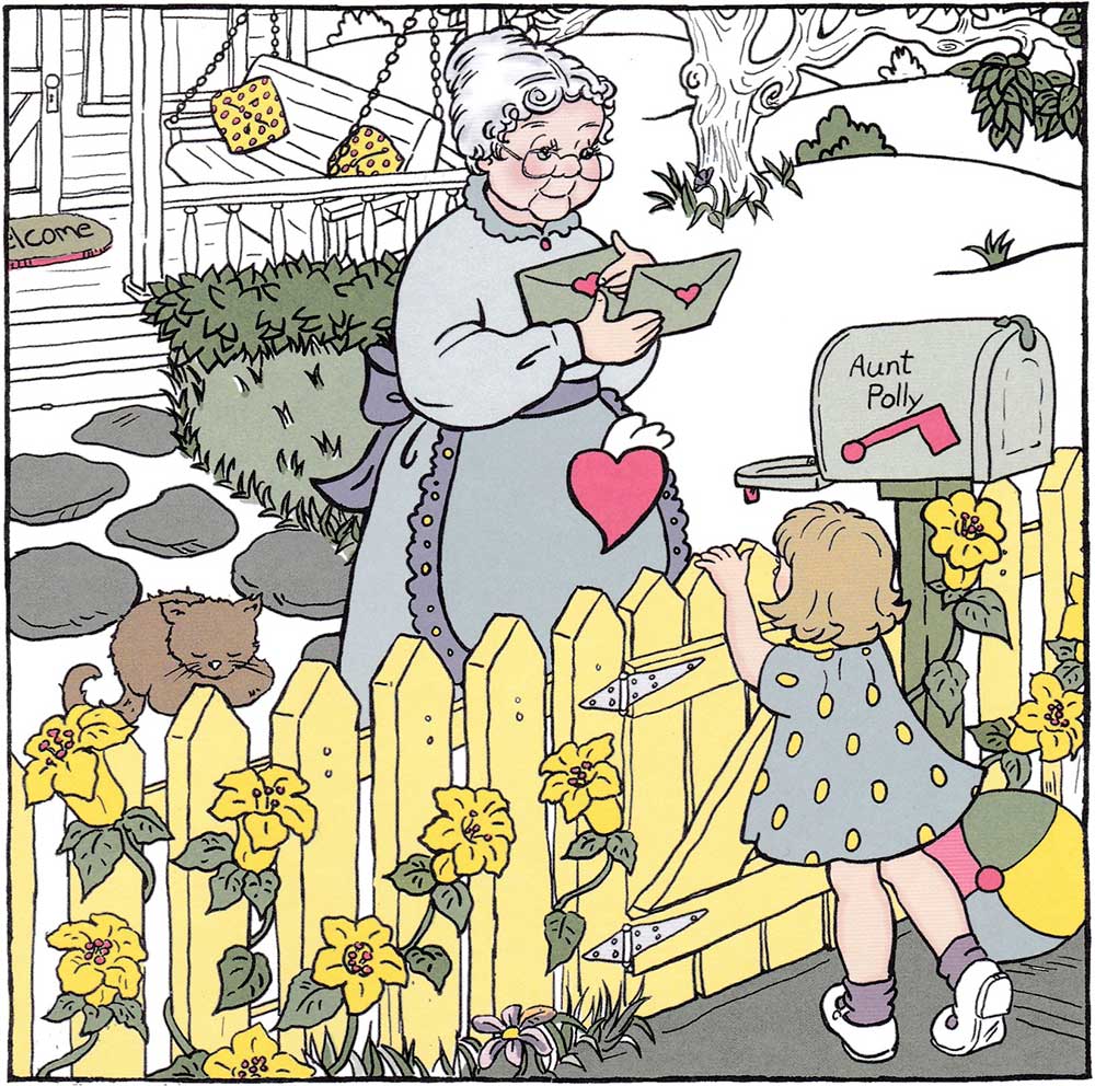 DEAR AUNT POLLY has the wisdom and vitality of a life well-lived. She is old-fashioned in appearance yet has a contemporary outlook, complete with friends of all ages and a multitude of interests. She is a playful guide and storyteller, a caretaker and confidant; and she attracts children with her ingenuity, engaging them with magical letters and exciting adventures. Joining her are Uncle Pete and a diverse yet close-knit group of neighborhood children, who call themselves the Cousins Club.