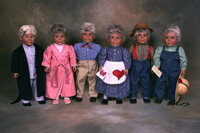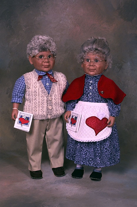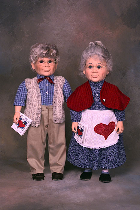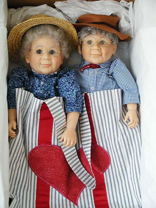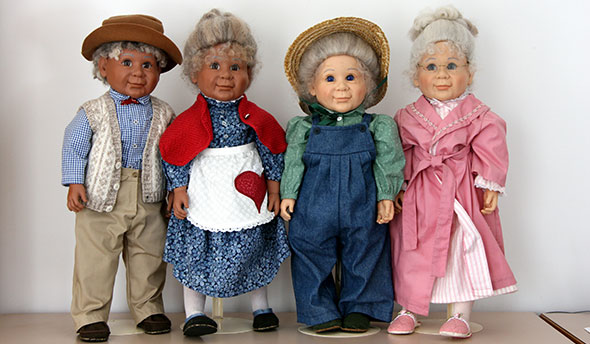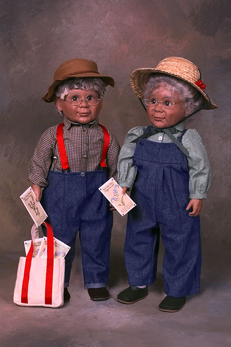 Aunt Polly and Uncle Pete dolls are beautifully crafted of high quality materials. They have soft, huggable bodies and washable vinyl faces, arms and legs. Their wigs are made of 100% Lincoln Longwool, washed and styled for each doll.